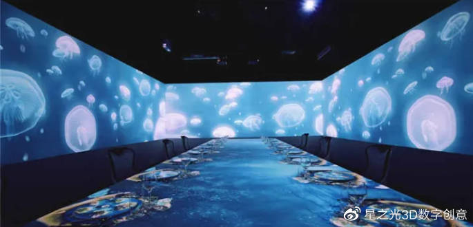與傳統(tǒng)的用餐空間相比,沉浸式全息投影餐廳的視覺效果更加適合年輕人。作為投影媒介的墻面、地面和桌面,除了具有主題視覺之外,還能與互動(dòng)娛樂相結(jié)合,形成有趣的互動(dòng)游戲,增加用餐的樂趣。