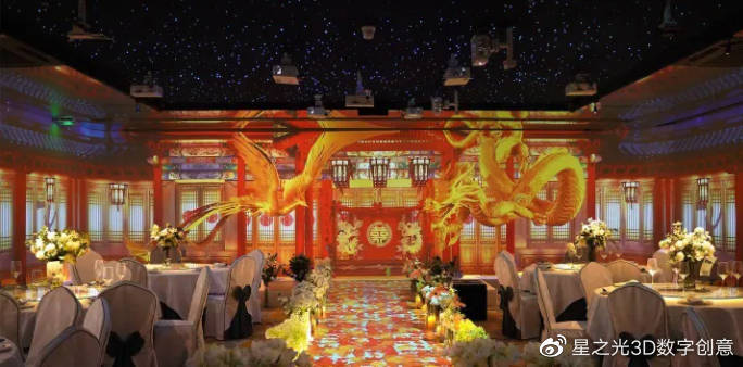 5D全息投影宴會廳,是以三維全息投影技術(shù)為基礎(chǔ),采用環(huán)幕投影、紗幕投影、互動 T臺投影、3D婚紗投影、全息舞美等技術(shù),突破聲、光、電的局限和空間的局限,營造出一種沉浸式的體驗。