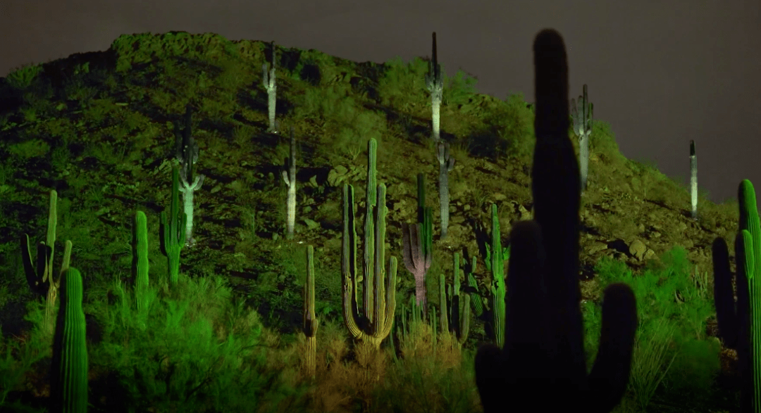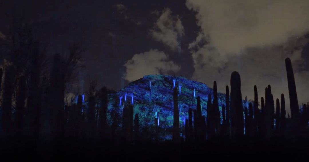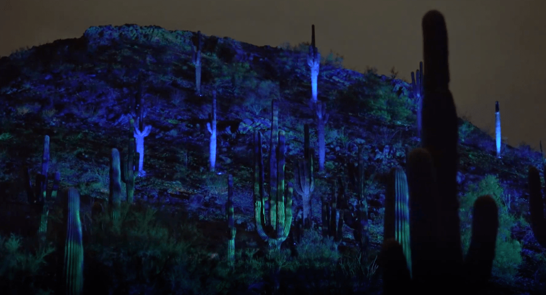 Desert Chorale利用一片生長著巨柱仙人掌的小山坡創(chuàng)作展覽的內容,每隔20分鐘就會上演一次光影表演。