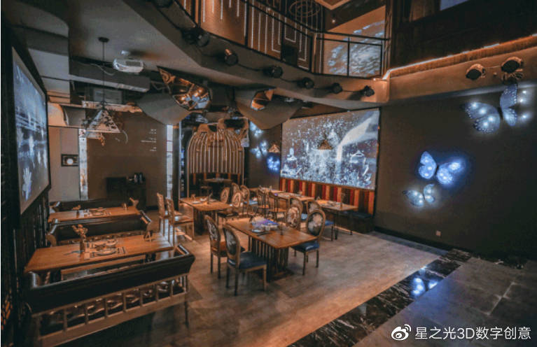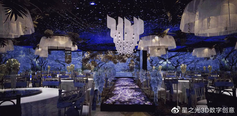 傳統(tǒng)的宴會廳,大多采用投影技術(shù),但效果并不理想,而新型的宴會廳,則是將5 D光影技術(shù)投射到墻壁上,讓賓客身臨其境,宛如置身于一幅畫卷之中。